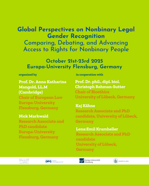 We would like to inform you of the upcoming symposium “Global Perspectives on Nonbinary Legal Gender Recognition. Comparing, Debating and Advancing Access to Rights for Nonbinary People” organised by S05. This workshop-style symposium will bring together international legal scholars in an intimate and intense gathering for in-depth-discussions and the common development of analyses of and new approaches to the situation of nonbinary people in law. The symposium takes place next week Tuesday, October 21st to Thursday, October 23rd at the campus of Europe University Flensburg.